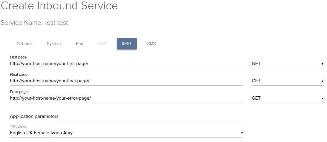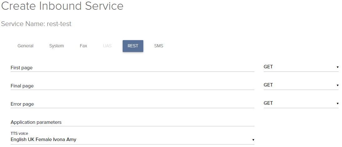 Now go ahead and click the REST tab. You should see a simple form, with First Page, Final Page and Error page, each with a HTTP Request Method next to them. You should also see Application Parameters and TTS Voice settings options. Don't worry about these for now, we'll come back to them later.