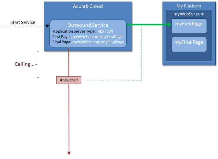 You start your outbound application using the name of your Outbound Service. Aculab Cloud makes a call and when it is answered Aculab Cloud starts an instance of your application by calling its First Page.
